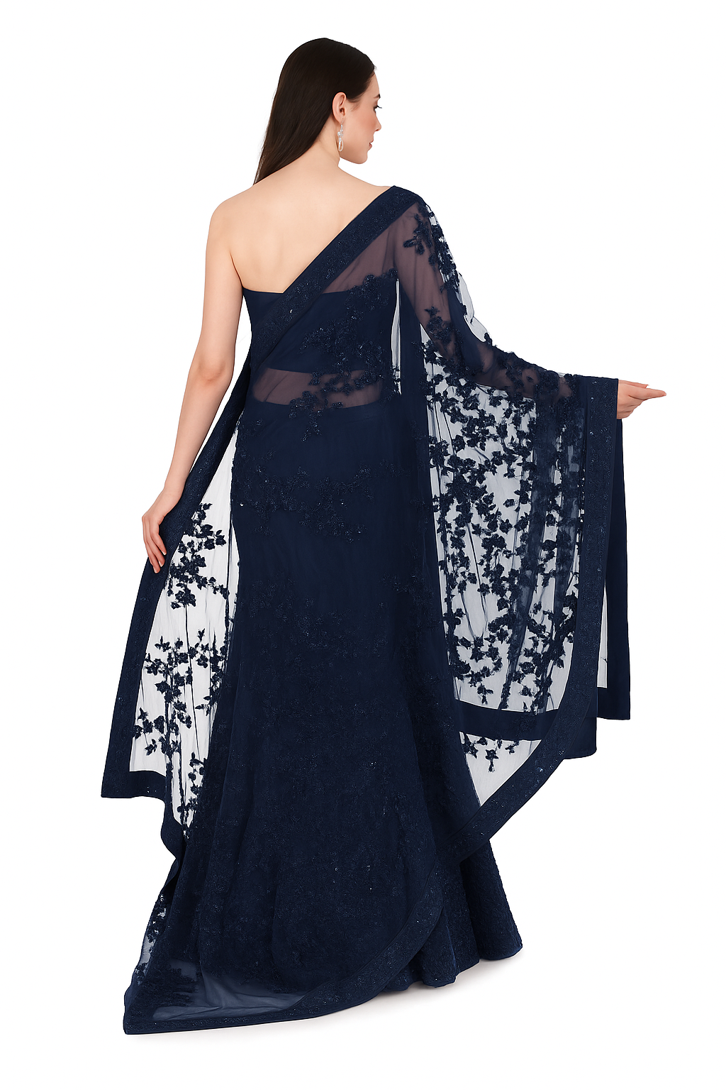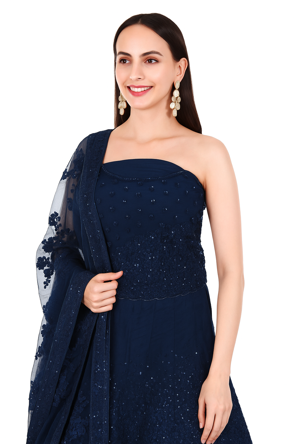 Please note: The actual colour of the product may vary slightly due to lighting conditions during photography. The lehenga, however, retains its deep navy blue richness that enhances its beauty in person.