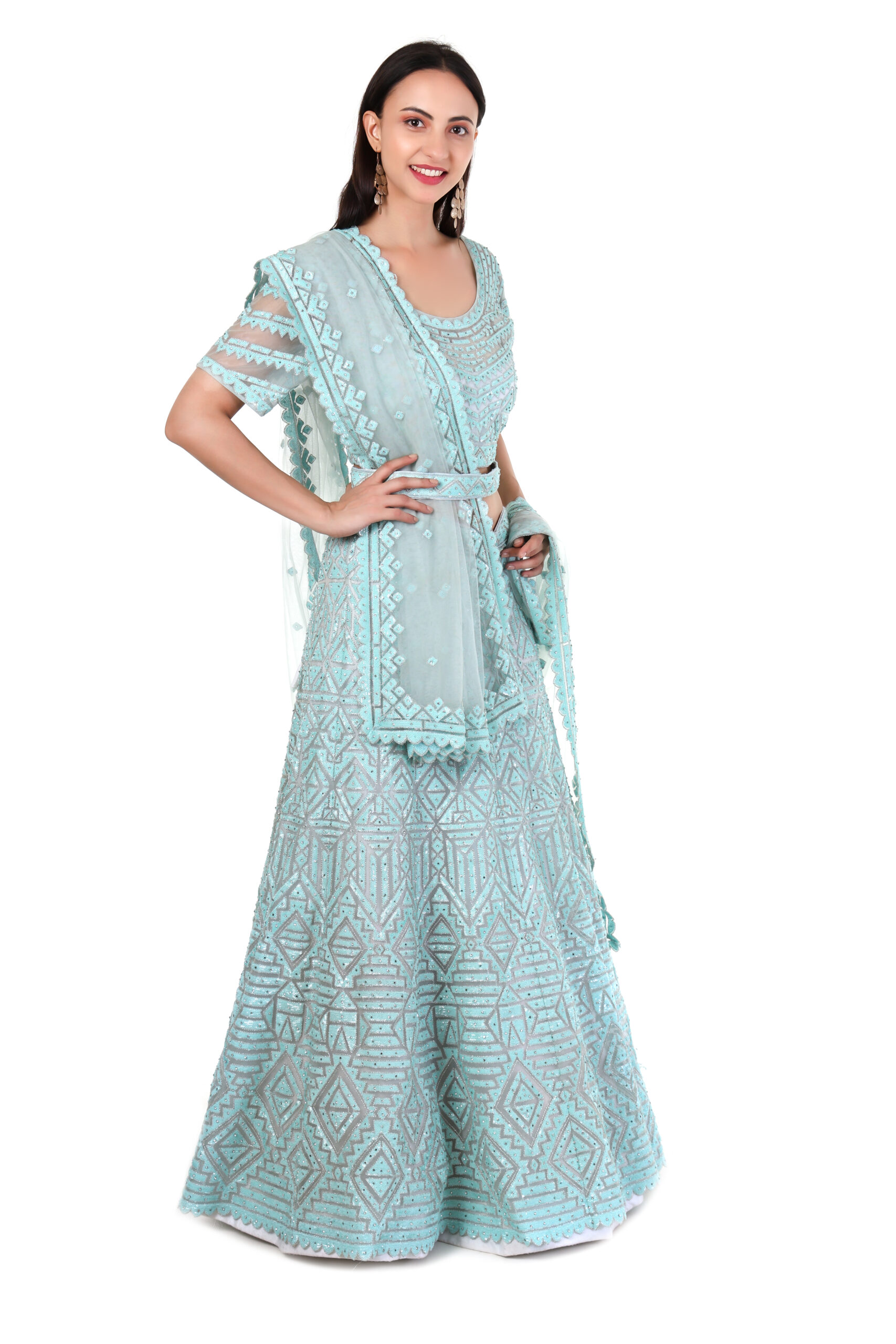 This complete set includes a ready-made blouse, a beautifully tailored lehenga, and a matching dupatta. Each piece is thoughtfully designed to create a cohesive and stylish ensemble. The blouse features stunning embroidery with intricate detailing, while the lehenga displays fine craftsmanship in geometric motifs. To complete the look, the net dupatta drapes elegantly, offering a regal finishing touch.